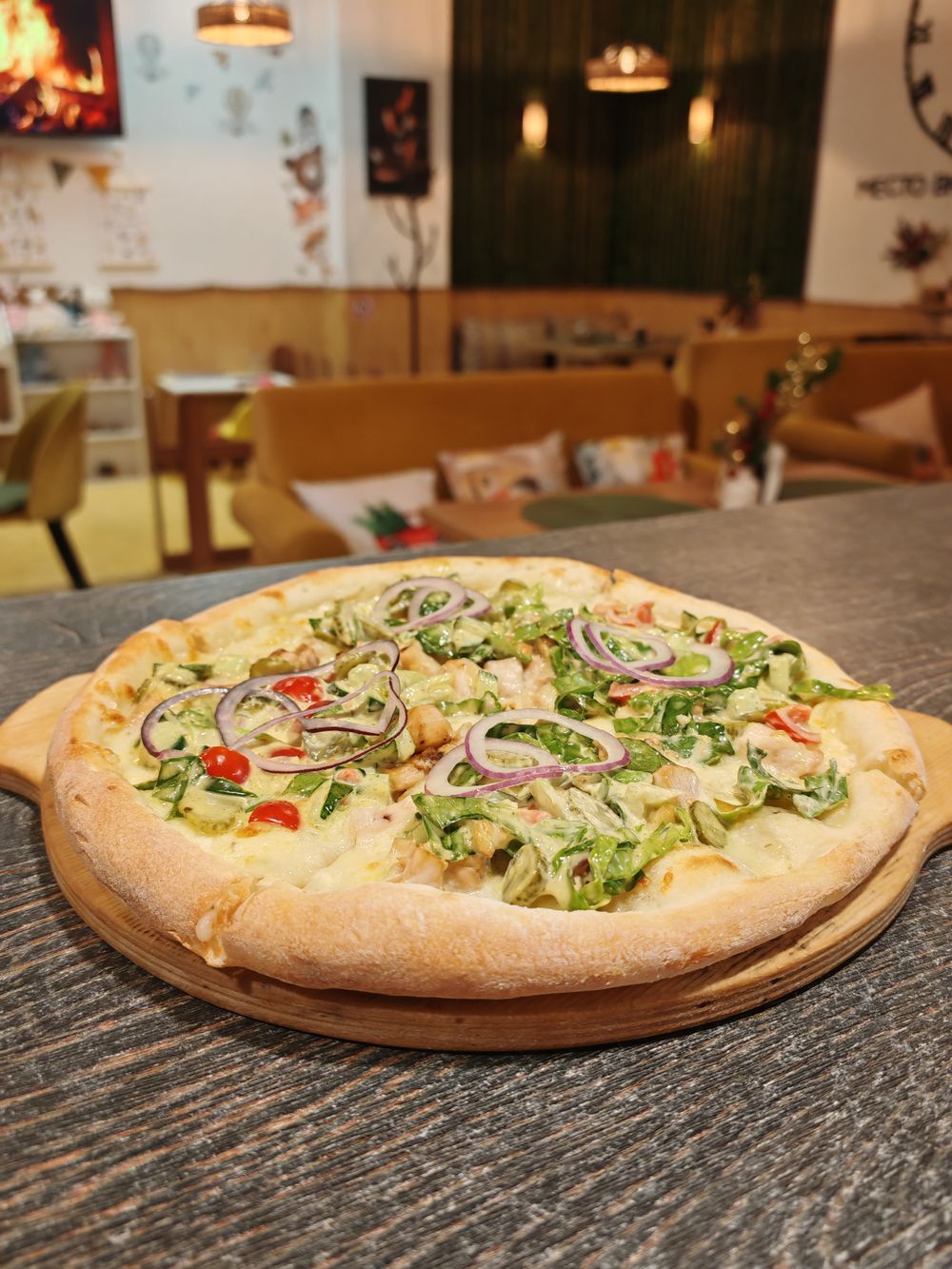 Пицца на тонком тесте со сливочным соусом, сыром Моцарелла. Начинка из нежного куринного филе с добавлением свежего салата, авторского соуса шаверма. Украшена красным луком.