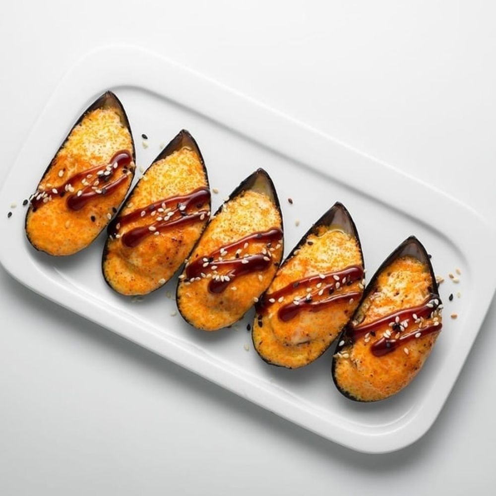 Мидии, остро-пряный соус (спайси), соус унаги, кунжут, сыр пармезан.
