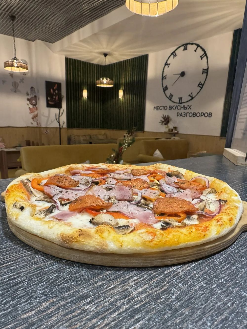 Пицца на тонком тесте с томатным соусом, сыром моцарелла. Начинка состоит из ароматных шампиньонов, красного лука, паприки, душистого перца, бекона и пепперони.