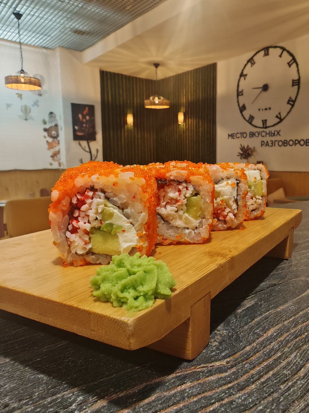Сливочный сыр, краб, авокадо, икра оранжевая.